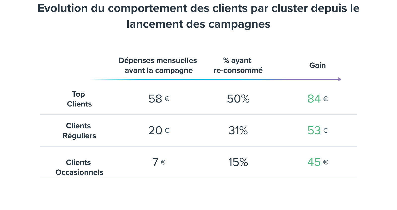 En examinant de plus près l'audience activée par la campagne de fidélisation, nous avons constaté une augmentation prononcée des dépenses mensuelles parmi les clients ayant des comportements d'achat différents. En réalisant une étude en cluster qui a examiné la consommation des clients en fonction de leurs dépenses mensuelles, nous avons remarqué que les clients les plus précieux, qui dépensaient en moyenne 58 € par mois, ont augmenté leurs dépenses de 45 % pour atteindre 84 € de dépenses mensuelles. L'augmentation des dépenses est également valable pour les clients réguliers et occasionnels, qui ont vu leurs dépenses mensuelles augmenter de 2,7 x et 6,4 x respectivement.
