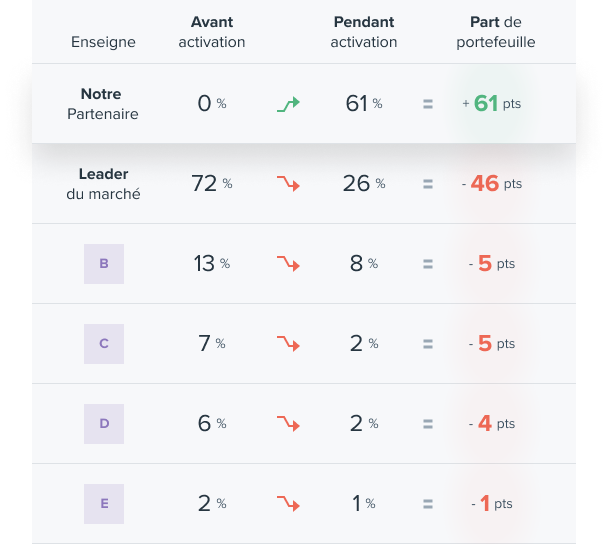 Sur toute la durée de la campagne, notre partenaire a gagné 61 points de part de portefeuille chez les clients qui avaient fait des achats chez les concurrents au cours des six mois précédents, ce qui a entraîné une chute de 46 points pour son principal concurrent.