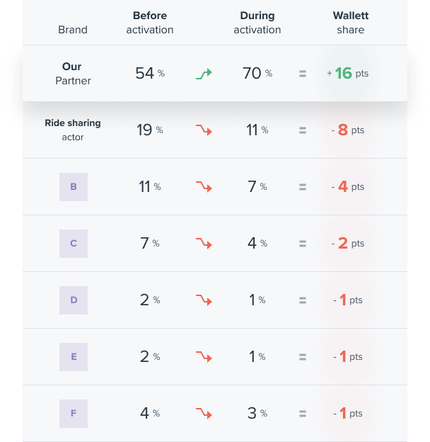 During the duration of the campaigns, the wallet share of our partner saw an immediate increase among its direct competitors and across the broader urban mobility sector, which includes ride-sharing and bike rentals.