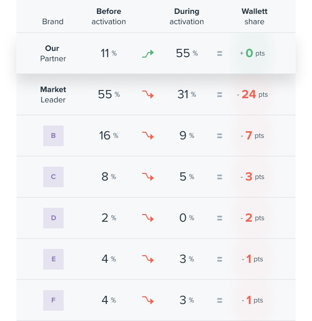 Wallet share was also significantly affected by the campaigns, which saw the restaurant increase their share by 38+ points in the three months the campaigns were active. The gain in wallet share came to the detriment of the market leader, who lost a significant 24 points in wallet share among the clients activated in the campaign.