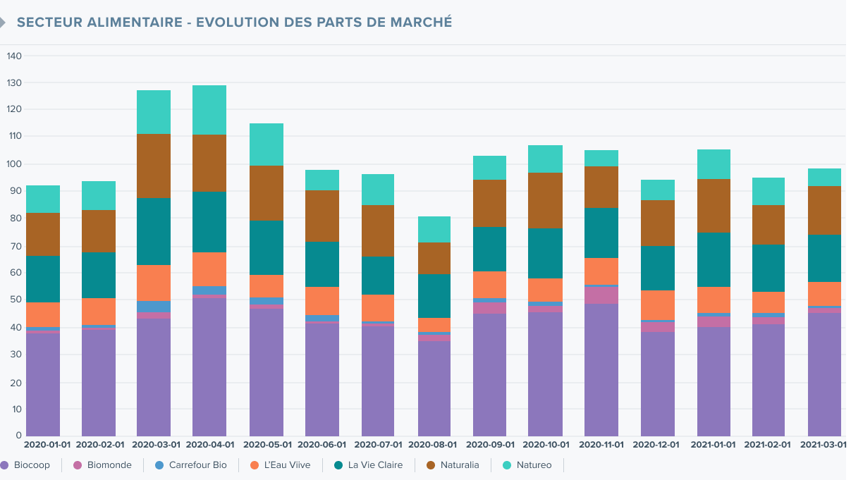 Si l'on examine de plus près les marques bio dont l'activité a augmenté au cours de la même période, on constate de légères augmentations chez tous les concurrents. Si nous nous concentrons sur les parts de marché au cours de l'année entière, nous constatons que Biocoop prend une part importante du marché, suivie d'une course serrée entre La Vie Claire et Naturalia.