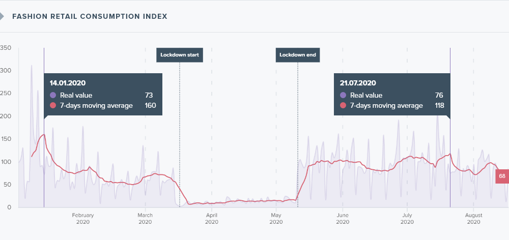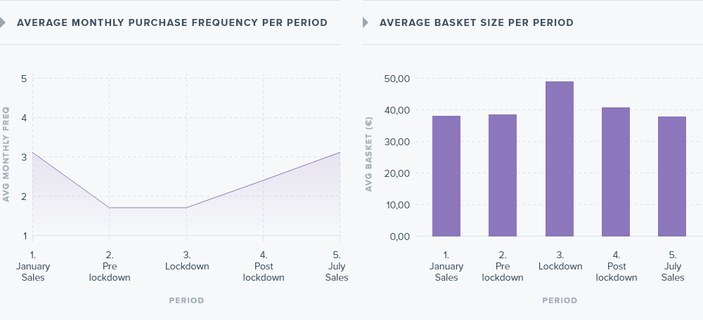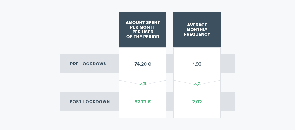 Quite possibly, the most interesting take away from the analysis of fashion consumption was the increase observed in the post lockdown period. During the two months following confinement, monthly spending per user was considerably higher (82€) than the pre-lockdown period following sales (74€). The purchase frequency also increased following the lockdown coming in at 2.02 times per month versus the 1.9 times per month registered pre lockdown.