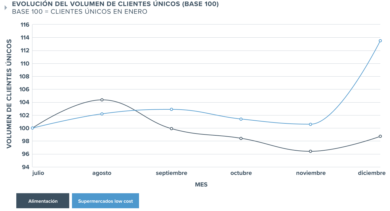 Impulsado por las fiestas de fin de año, el sector de los supermercados de descuento experimentó en diciembre un aumento de casi el 13% en clientes únicos con respecto a julio. Por el contrario, los supermercados tradicionales se estancaron durante gran parte del año y experimentaron un descenso de agosto a noviembre, seguido de un ligero aumento de 2 puntos porcentuales en diciembre.