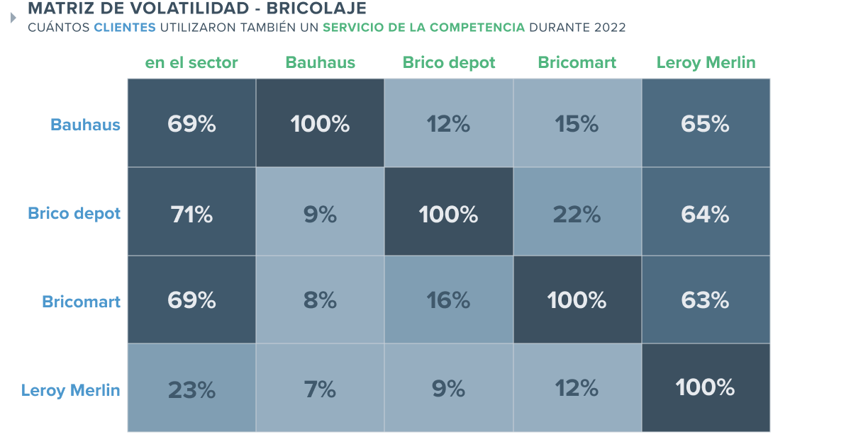 Otro hecho común del sector es el dominio absoluto de Leroy Merlin. Casi 9 de cada 10 (el 87% de los clientes del sector) clientes únicos del sector de la mejora del hogar realizaron al menos una compra con el gigante francés el año pasado. Comparativamente, la siguiente cadena en importancia, Bricomart, sólo consiguió atraer a aproximadamente 2 de cada 10 clientes del sector. La cadena líder también obra su magia a la hora de atraer a los clientes de sus competidores. Si observamos la volatilidad en el sector, aproximadamente 6 de cada 10 clientes de Bauhaus, Brico Depot y Bricomart realizaron una compra en Leroy Merlin. Por el contrario, su mayor competidor, Bricomart, sólo vio cómo el 12% de los clientes de Leroy Merlin compraban en sus tiendas. En todo el sector, sólo el 23% de los clientes de Leroy Merlin compraron en otro minorista de artículos para el hogar.
