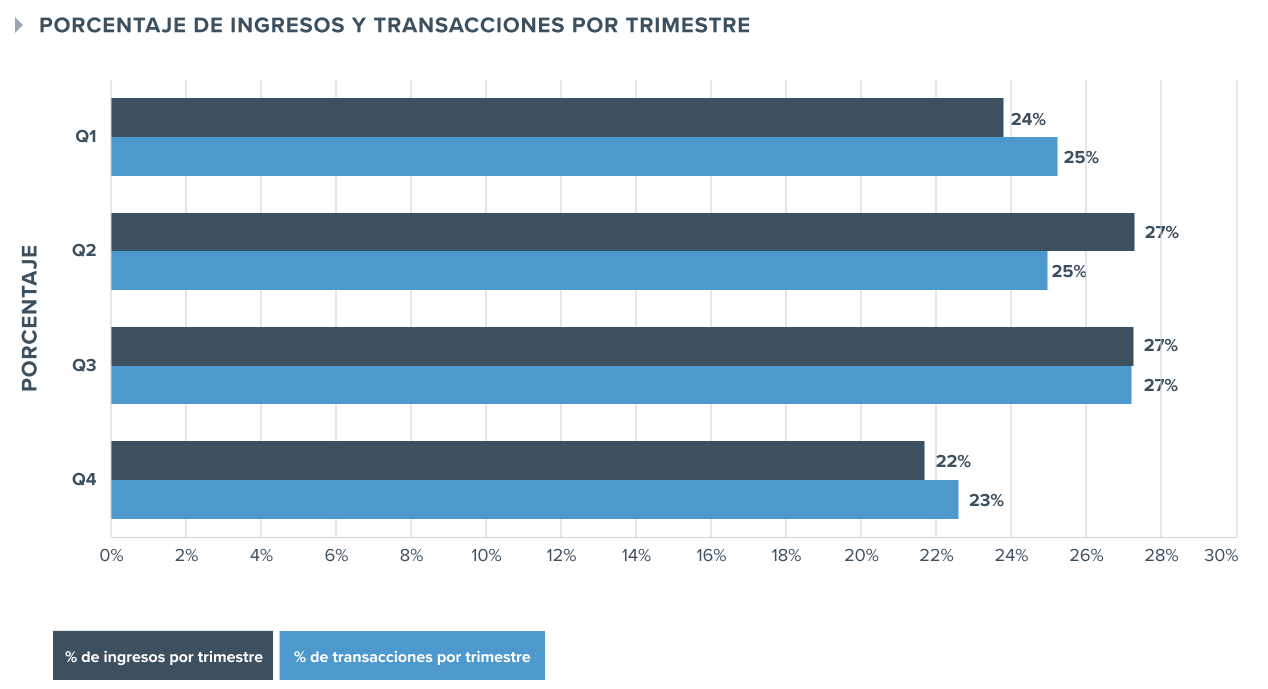 Es importante señalar que, aunque el segundo trimestre aportó el 27% de los ingresos generados en 2022, sólo representó el 25% de todas las transacciones. Esto puede deberse en parte al tipo de productos que compran los consumidores en primavera, que suele ser una estación en la que los consumidores privilegian las mudanzas y el inicio de reformas, por lo que adquieren artículos de mayor valor.