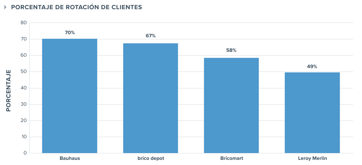 Si observamos la rotación de clientes desde el punto de vista de las marcas, vemos que Bauhaus y Brico Dépôt son las más afectadas por la rotación, con un 70% y un 67% de sus clientes del primer trimestre que no compraron en el segundo trimestre de 2022. Los líderes del mercado, Leroy Merlin, tampoco se salvan de la tendencia. Por término medio, seis de cada diez clientes de Bricomart y la mitad de los de Leroy Merlin que hicieron una compra en el 1er trimestre no siguieron con una compra en el 2do trimestre.