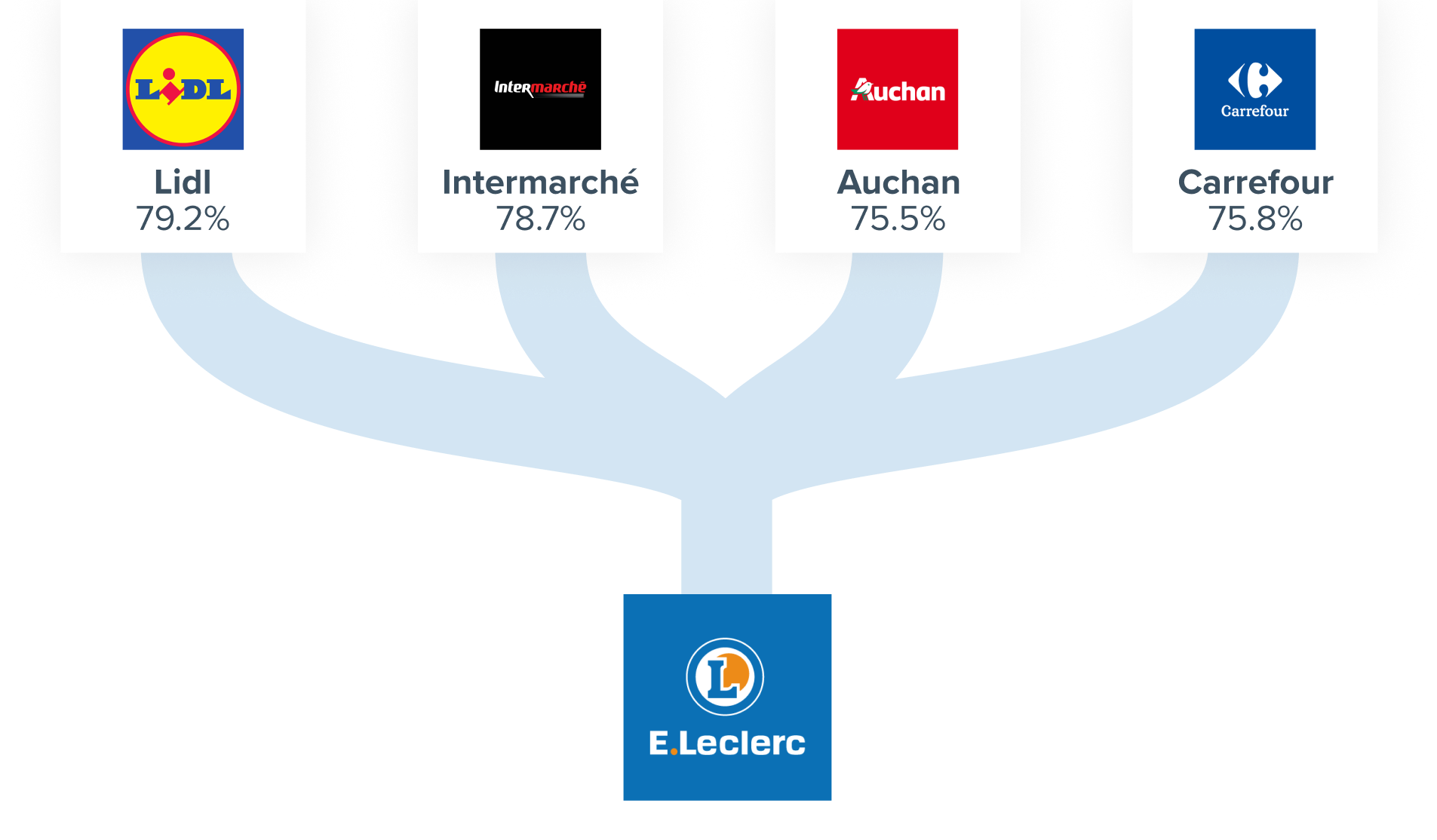 - La majorité des clients de Carrefour (75.8 %), Intermarché (78,7 %), Lidl (79.2%) et Auchan (75.5 %) font aussi leurs courses chez E.Leclerc.