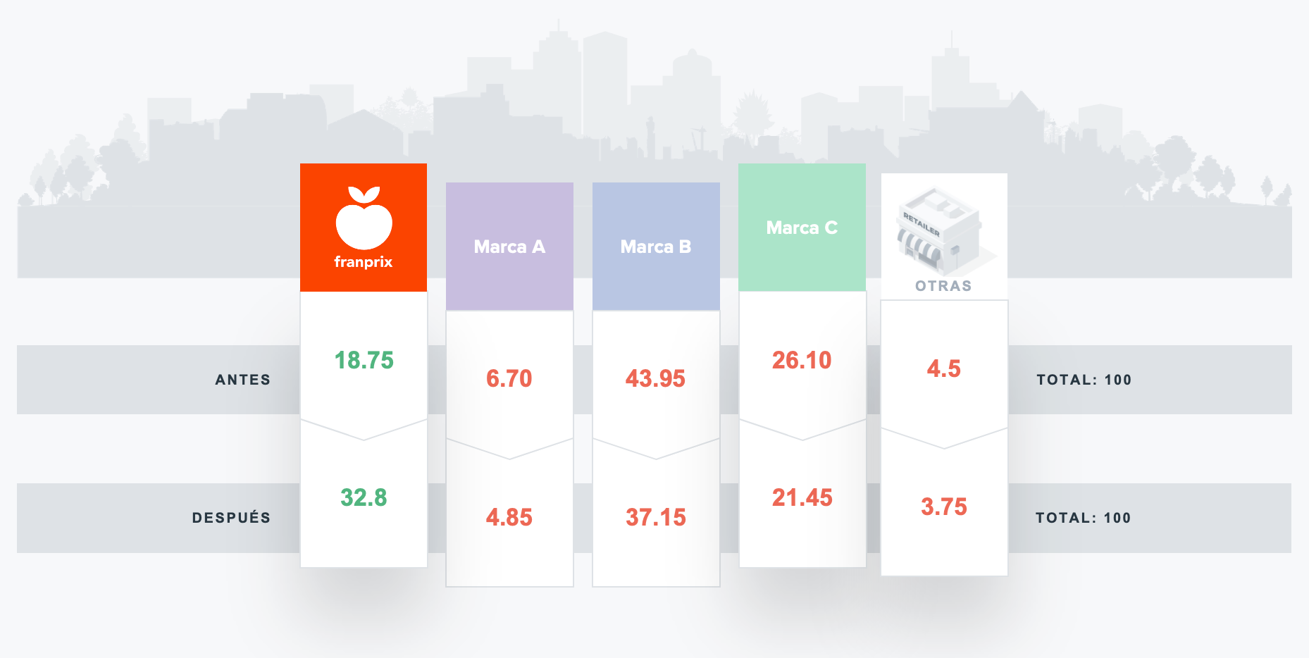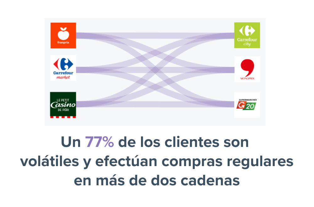 A pesar de la inigualable densidad de su red en la región, la volatilidad de la base de clientes de Franprix y de la vertical de supermercados en general sigue siendo muy alta, con un 77% de los consumidores realizando compras frecuentes en marcas competidoras durante todo el año.