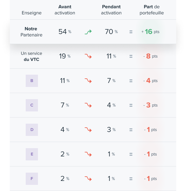 Parmi ses concurrents directs, notre partenaire a enregistré une augmentation de 19 points de sa part de portefeuille, au détriment du service concurrent. Pour ce qui est de l'ensemble du secteur de la mobilité, il a constaté une augmentation de 16 points de sa part de portefeuille, principalement aux dépens d'un service de covoiturage.