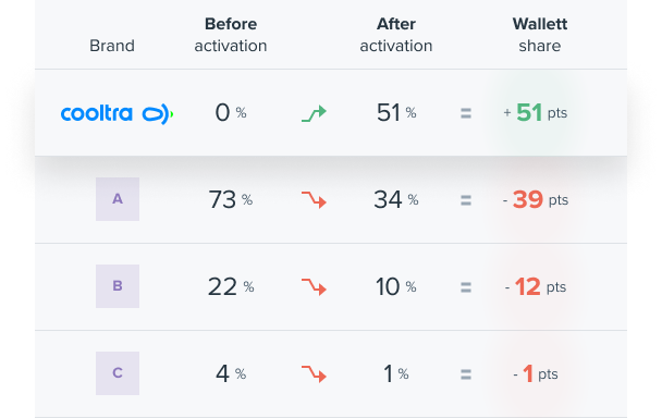 The pull of an automatic cashback reward resulted in a significant increase in wallet share coming from their competitors in France. Cooltra saw their wallet share rise by +51 points while competing urban mobility players saw substantial dips during the campaign.