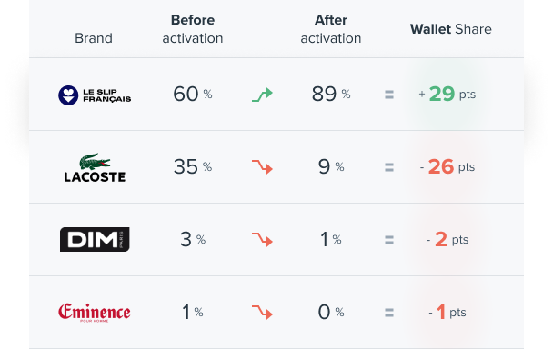 The campaign had an immediate impact and resulted in Le Slip Français winning 29 points of wallet share by the end of the campaign, with a majority coming directly from Lacoste customers, followed by DIM (-2 pts) and Eminence clients (-1 pts).