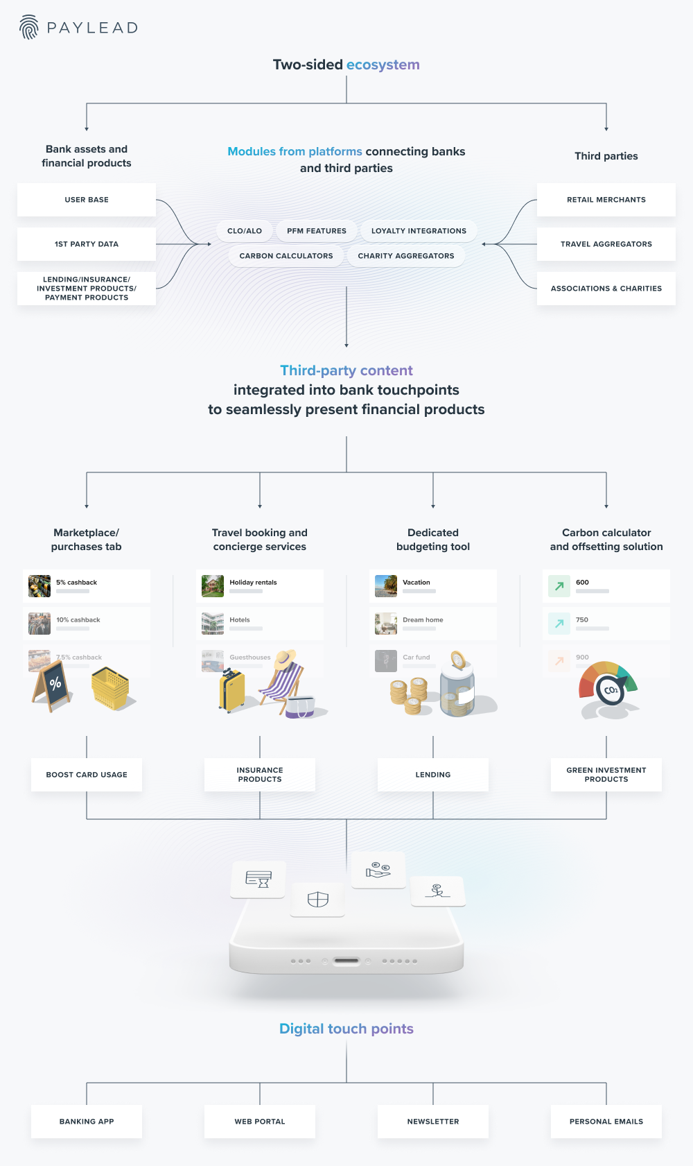 These ecosystems provided by platforms allow banks to leverage their assets, such as customer touchpoints and banking data, to diffuse personalized content to users where banks can present relevant financial products.