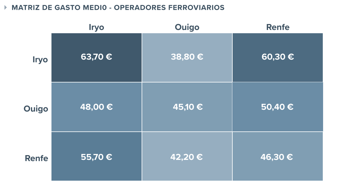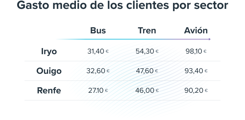 Sin embargo, los clientes de Iryo también gastan más al usar los servicios de competidores como Renfe. En promedio, un cliente de Iryo paga €60 por un billete de tren con Renfe, lo que equivale a €14 más que los clientes de Renfe.