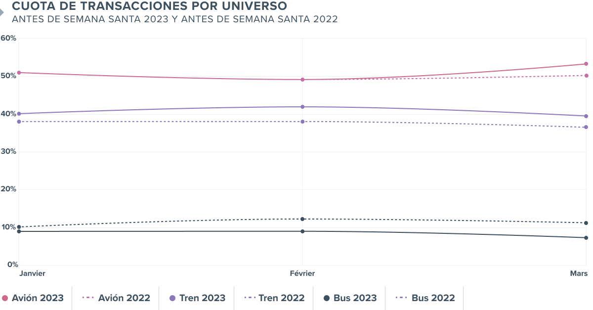 En marzo, los viajes en avión representaron más de la mitad de todas las compras en la categoría de larga distancia y fueron +2,3 puntos porcentuales más altos que en enero y 2,6 puntos porcentuales más que el porcentaje que representaron en marzo de 2022. Los viajes en avión siguieron siendo el líder constante en los tres meses previos a la Semana Santa. Con el 39,5% de todas las transacciones en marzo de 2023 y aproximadamente el 40% del mercado en el primer trimestre, los viajes en tren siguen siendo la mayor alternativa a volar, mientras que los autobuses solo representaron el 7 al 9% de las transacciones. El viaje en autobús en realidad disminuyó en comparación con el año anterior, cuando las ventas de billetes representaron el 10 al 12% de todas las transacciones y cayeron 4,7 puntos porcentuales en marzo de 2023.