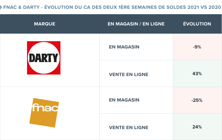 Si l’on étudie maintenant les chiffres des soldes de Darty et la FNAC, en boutique et en ligne, on constate un véritable retournement par rapport à 2020 : sur les deux premières semaines de soldes, les ventes en magasin de Darty ont baissé de 9% et les ventes en ligne ont fait un bond de + 43% ; pour la FNAC, les ventes en magasin ont baissé de 25%, les ventes en ligne ont augmenté de 24%.