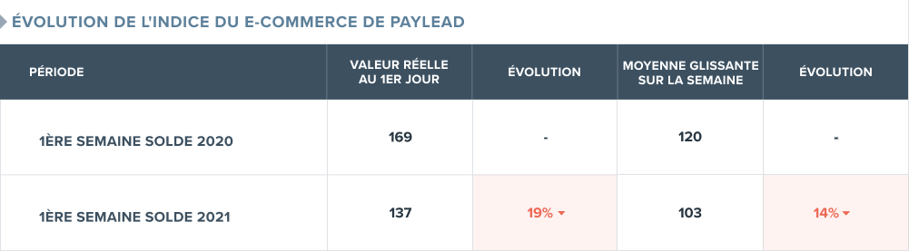Même constat, dans une moindre mesure, pour le e-commerce, avec un CA des soldes en ligne qui a baissé de 19% sur le premier jour par rapport à 2020, et de 14% sur la semaine.