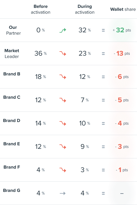 Looking at customer spending at grocery chains before and after the campaign, there was a 32+ increase in wallet share earned by the grocery chain, which mainly came to the detriment of their biggest competitor, who lost 13 points of wallet share, as well as several other competing chains in France.