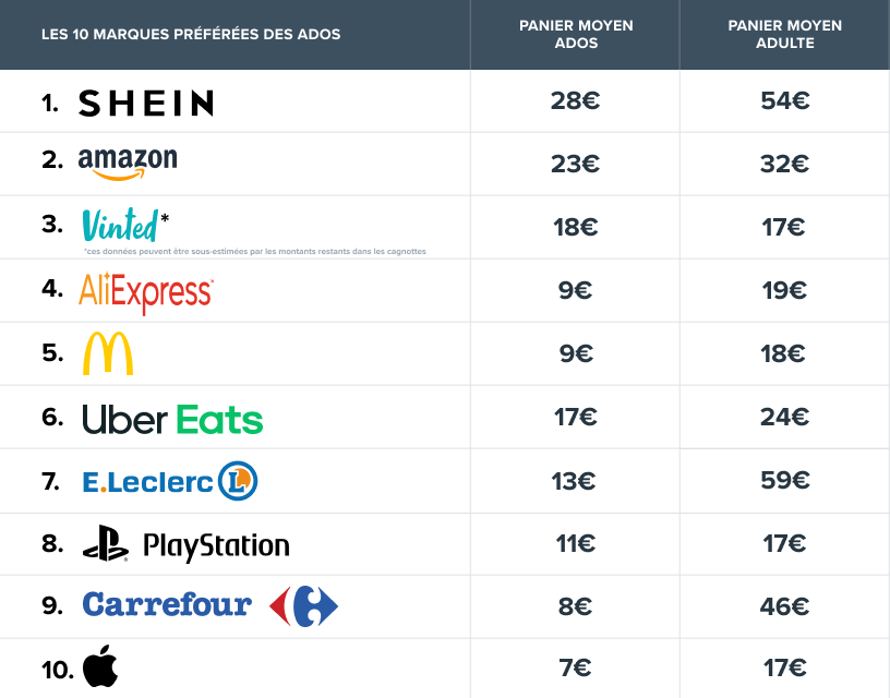Tout au long de cette routine, nous voyons certains des top 10 marques préférées par les ados: Shein, Amazon, Vinted, AliExpress, McDonalds, Uber Eats, Leclerc, Playstation, Carrefour, et Apple. Vous y verrez également les écarts de panier moyen entre ados et adultes pour chaque marque.