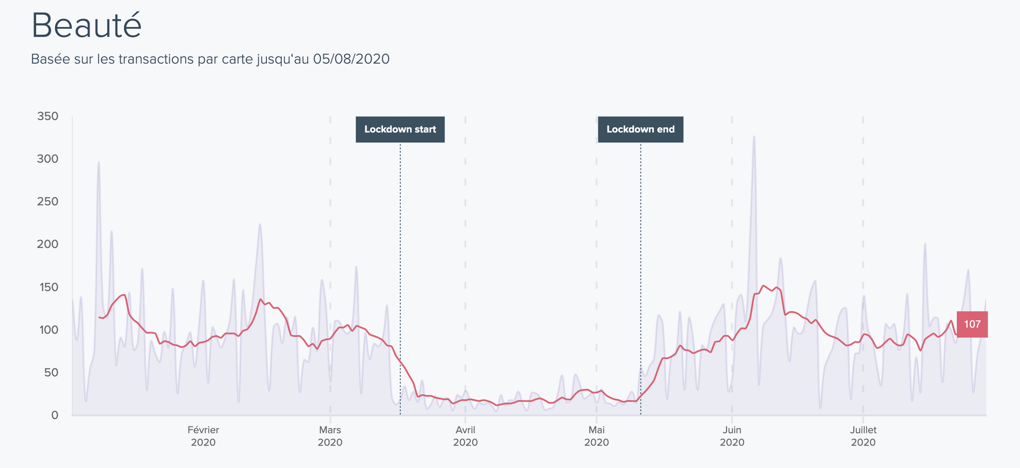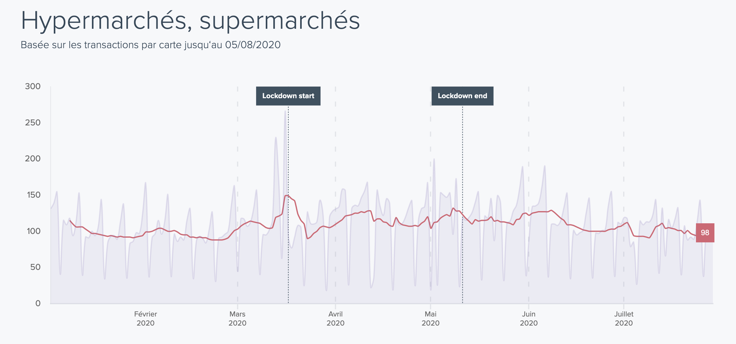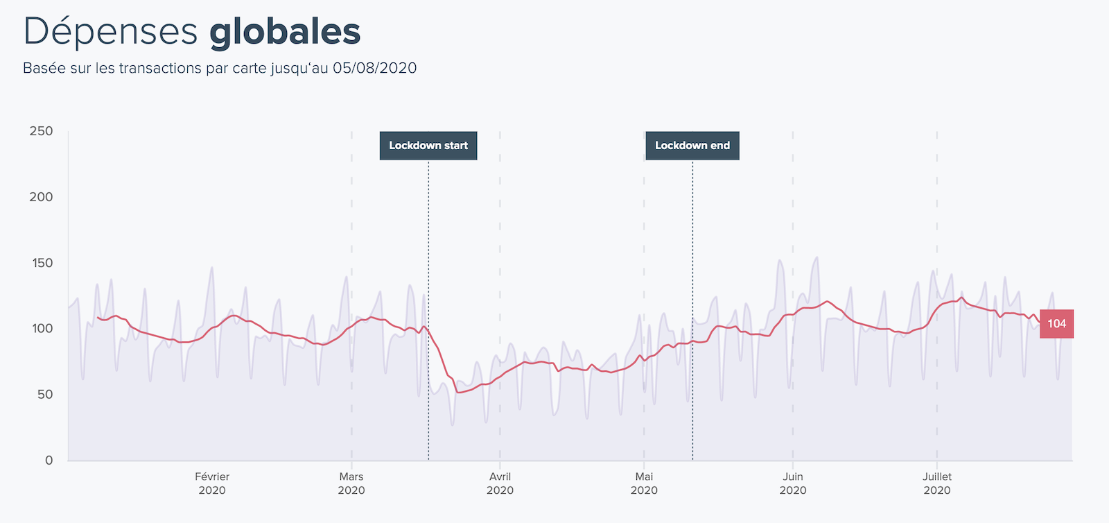Il s’agit de l’ensemble des dépenses par carte, tous secteurs confondus. Depuis le début de la crise, nous observons maintenant 4 temps très marqués :