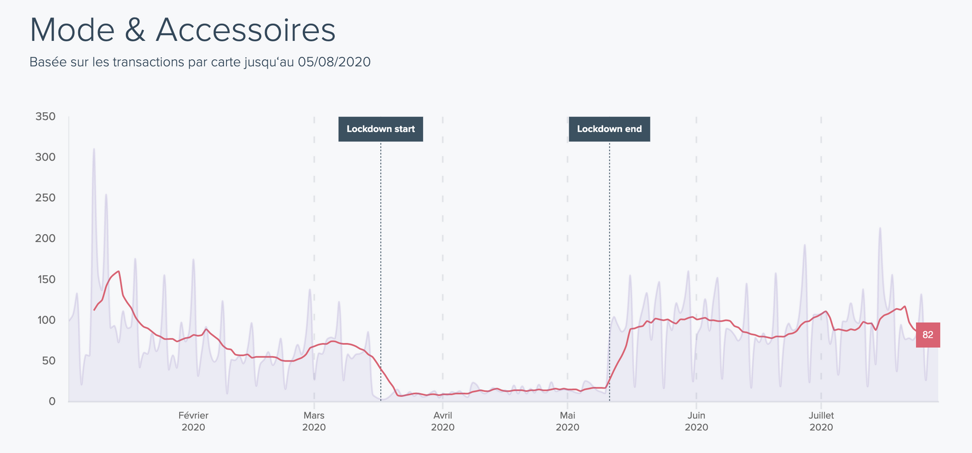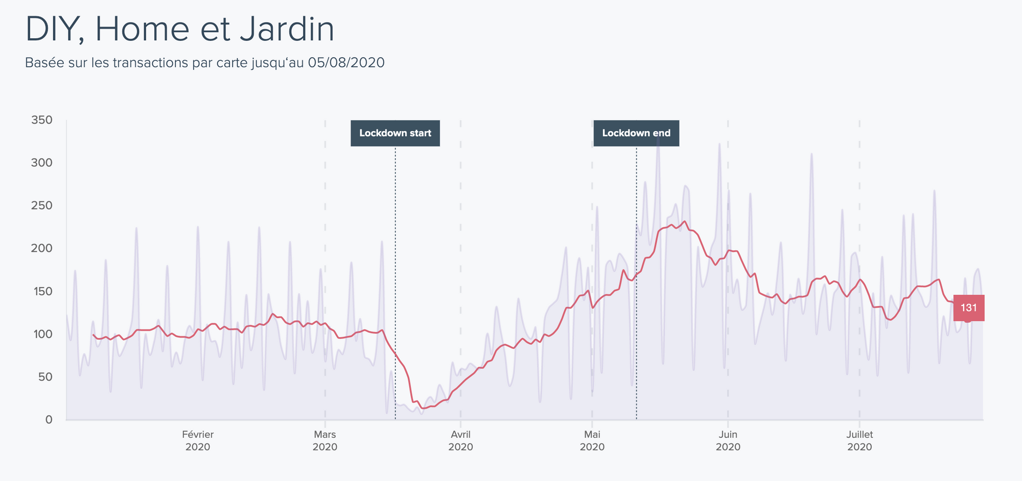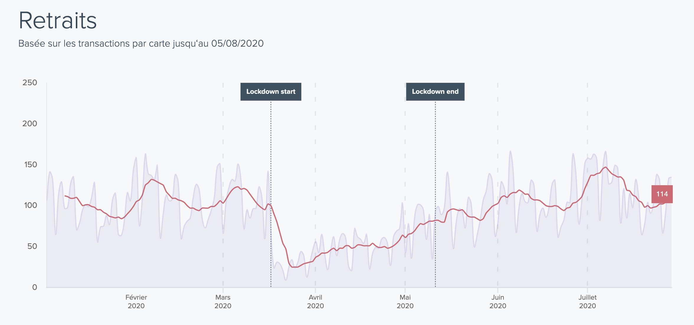 Il s’agit de l’ensemble des dépenses par carte, tous secteurs confondus. Depuis le début de la crise, nous observons maintenant 4 temps très marqués :