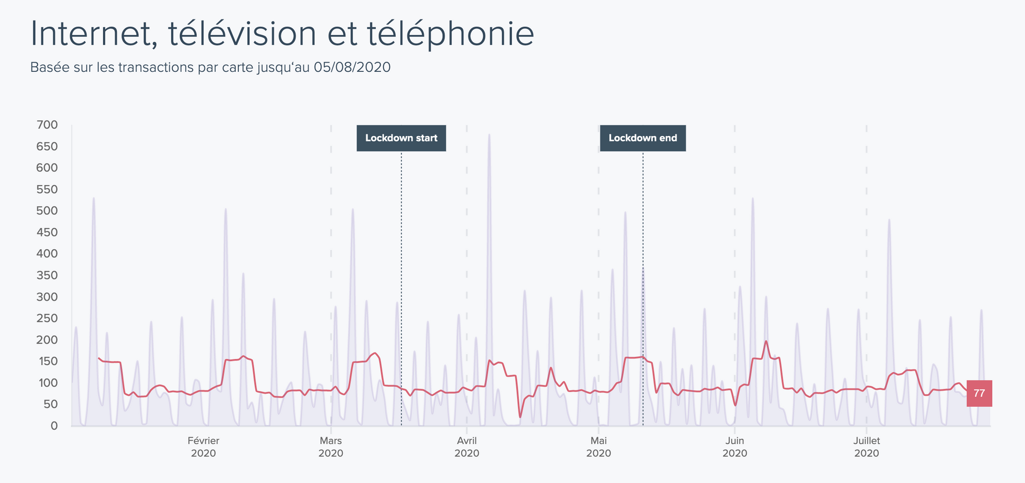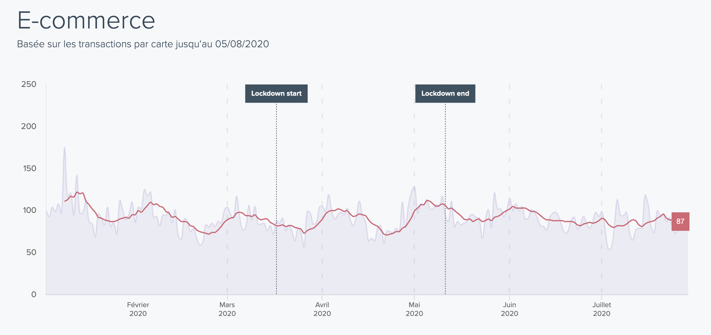 - E-commerce - Depuis le déconfinement, la consommation online semble être plus stable, en ayant son pic de début de mois plus atténué que jusqu'à maintenant.