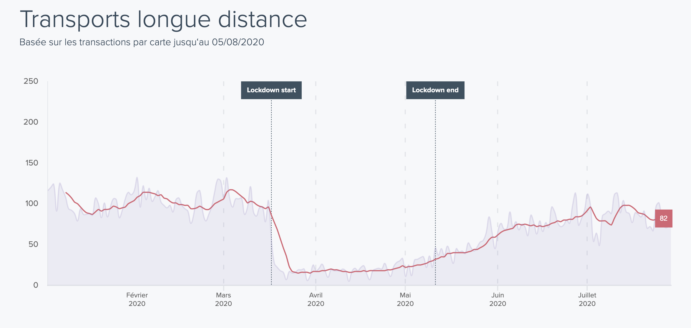 - Transports longue distance - Depuis Juin, l’indice des transports longue distance semble revenir petit à petit à la normale, boosté par le weekend du 14 Juillet et par les voyages de départ en vacances.