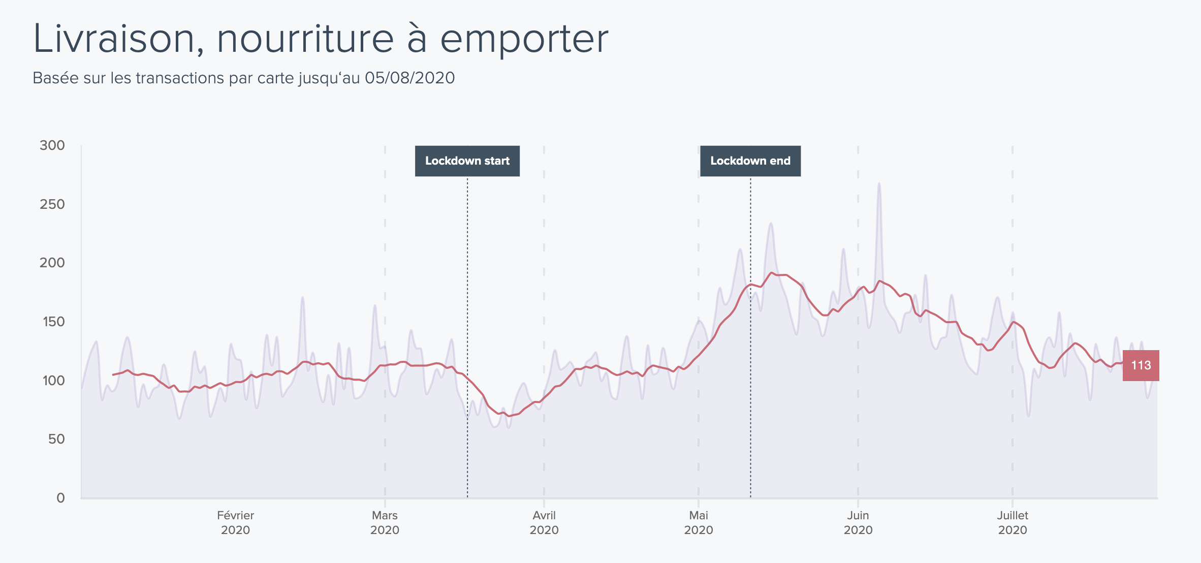 Avec la fin du confinement, les grandes chaînes de restauration ont pu ouvrir à nouveau et offrir des services de vente à emporter ou de livraison en propre. L’indice a bondi et s’est stabilisé à 80% de son niveau d’avant-confinement, ce qui correspondait alors à l’activité partielle des restaurants, qui ne pouvaient accueillir en salle.