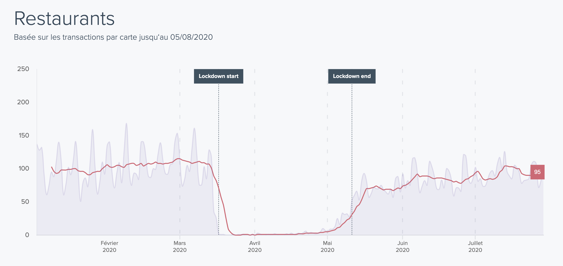 Avec la saison des vacances d'été en plein essor et le beau temps l’indice de la restauration a retrouvé des valeurs quasi identiques à celles pré-confinement (-10%), cependant celles ci restent basses pour la saison estivale.