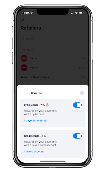 With a two-tier cashback system powered by payment marketing funded by merchants, Lydia receives a percentage of every reward earned by all participating users regardless of whether they use a card from another bank or Lydia's. However, by giving more generous cash earnings to Lydia card users, they're incentivizing the adoption of their premium card offering. The solution works to support its incumbent bank strategy by giving generous reward earnings to clients bringing in a monthly fee.