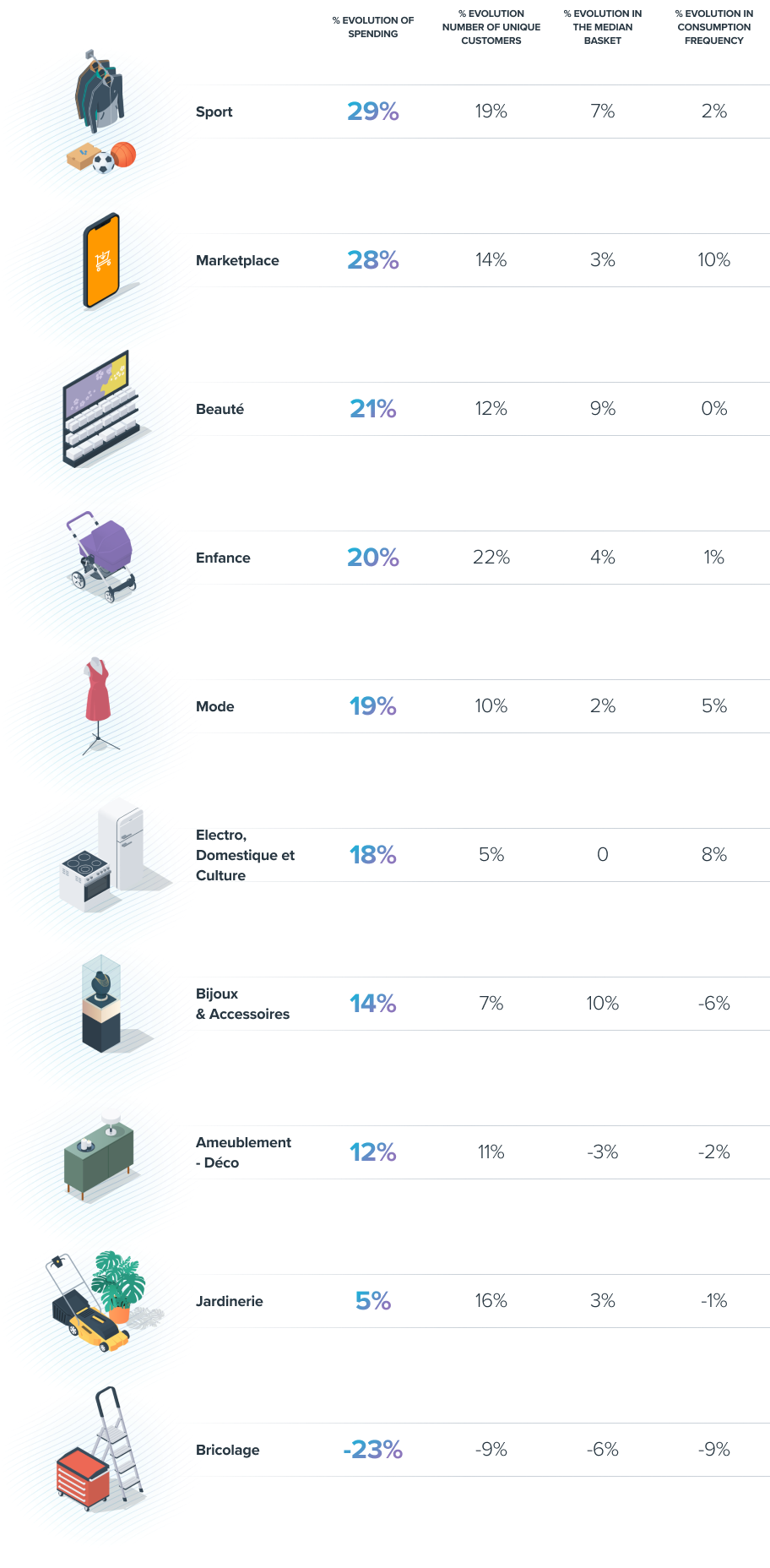 La mode, principale attraction des soldes pour beaucoup en France, a connu une augmentation des dépenses de 19 % par rapport aux soldes d'été de 2022. Cependant, les magasins de sport et de vêtements sportifs ont connu le bond le plus significatif en juillet, avec une augmentation de 29 % des dépenses. Ils étaient suivis de près par les places de marché en ligne (+ 28 %).