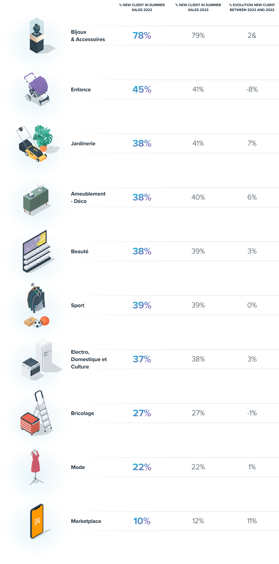 Malgré des émeutes qui ont dissuadé certains de chercher une bonne affaire en magasin, l'ombre de l'inflation planant en 2023 a positionné la période des soldes comme une opportunité pour les consommateurs d’acquérir plus de biens [ou une opportunité pour les consommateurs de dépenses plus] après s’être serrés la ceinture au cours des six derniers mois. Tous secteurs confondus, la catégorie bijoux et accessoires a connu la plus grande augmentation de nouveaux clients - ceux qui n'ont pas acheté au cours des trois derniers mois - avec 79 % des clients attendant les soldes d'été pour effectuer un achat. La plupart d’autres secteurs ont vu une augmentation de 38 % à 41 % de nouveaux clients achetant pendant les soldes.