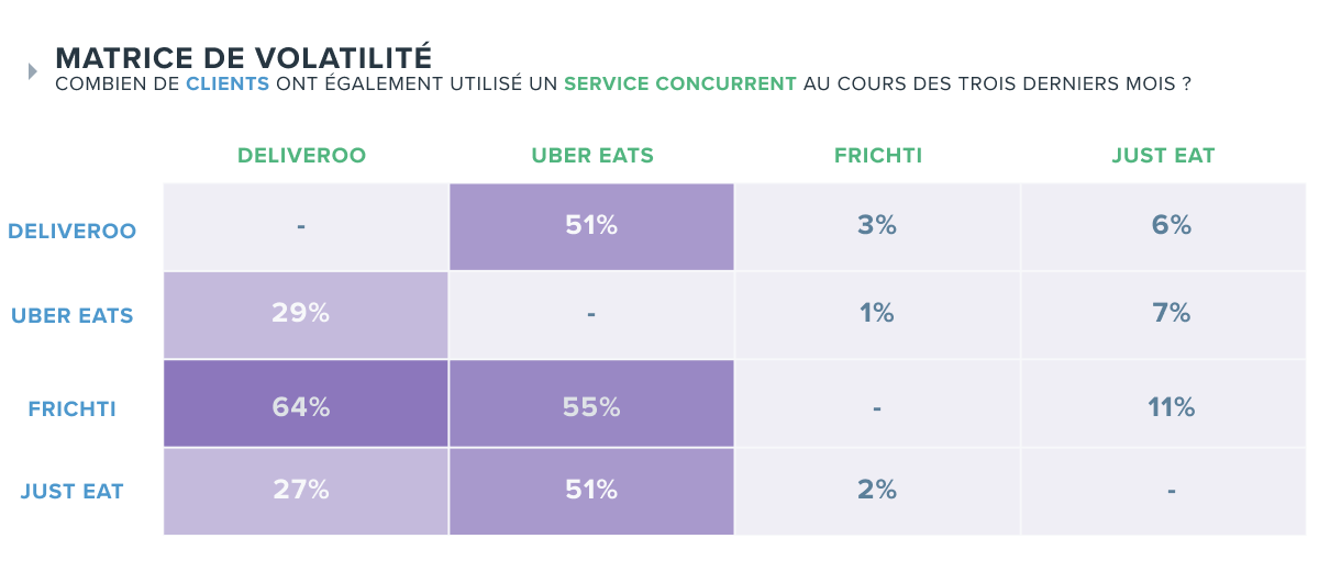 En termes de volatilité, cette guerre des prix et des services profite surtout à Uber Eats, puisque seulement 29% des clients Uber Eats fréquentent aussi le concurrent Deliveroo, tandis que 51% des clients Deliveroo commandent aussi chez Uber Eats.