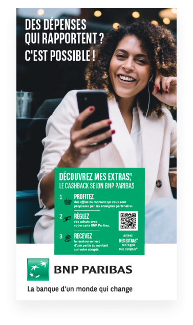 For large retail banks looking for inspiration, BNP Paribas provided an example to follow in utilizing their bank branches to display messaging highlighting the launch of their cashback program “Mes Extras”.
