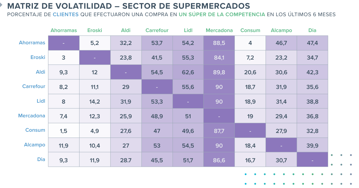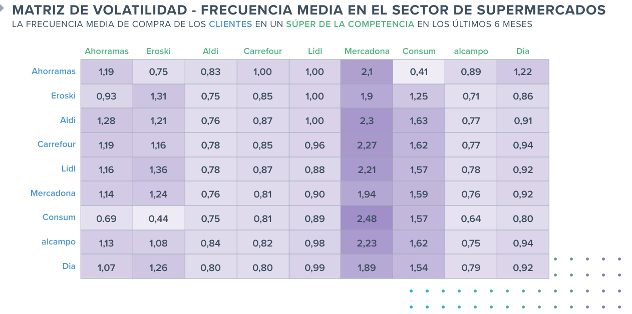 El dominio de Mercadona, la cadena que lidera el mercado, resulta evidente cuando nos detenemos a estudiar la volatilidad de los compradores de sus competidores directos. Entre el 84% y el 90% de los compradores del resto de marcas se han desplazado a Mercadona en el último mes. En comparación, Lidl, pese a haber atraído al porcentaje más significativo de compradores de Mercadona, tan solo logró que el 51% de la base de clientes de Mercadona acudiese a sus supermercados en el último mes.