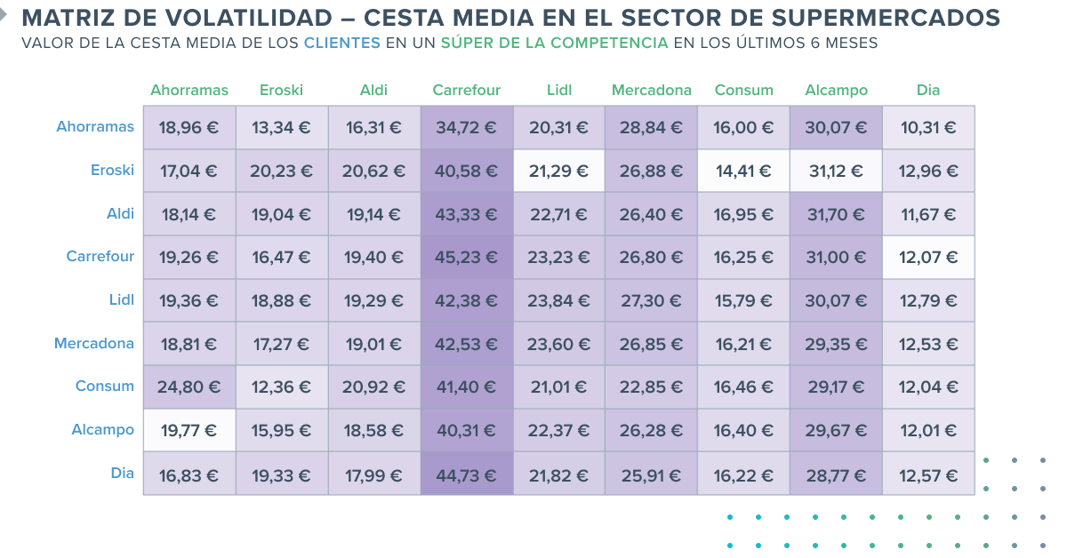 Cuando analizamos de forma específica el gasto de los clientes volátiles de diferentes cadenas, observamos que los clientes volátiles del resto de cadenas gastaron más en Carrefour. Los clientes de Dia, en concreto, fueron los que más dinero gastaron en Carrefour (44,73€), seguidos de los clientes volátiles de Aldi (43,33€) y de los clientes de Mercadona (42,53€).